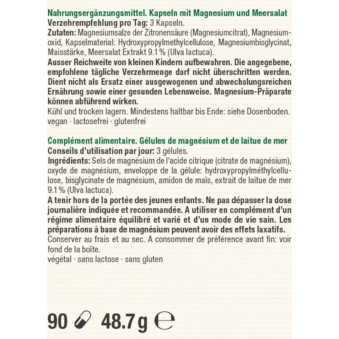 itronskābes magnija sāļi (magnija citrāts) un magnija oksīds, magnija bisglicināts, kukurūzas ciete, zaļaļģes (Ulva lactuca) ekstrakts, apjoma palielinātājs – hidroksipropilmetilceluloze (kapsulas apvalks). Nesatur laktozi, glutēnu. Vegāns.